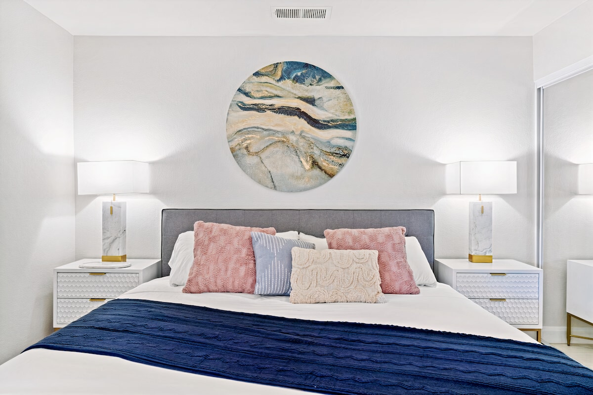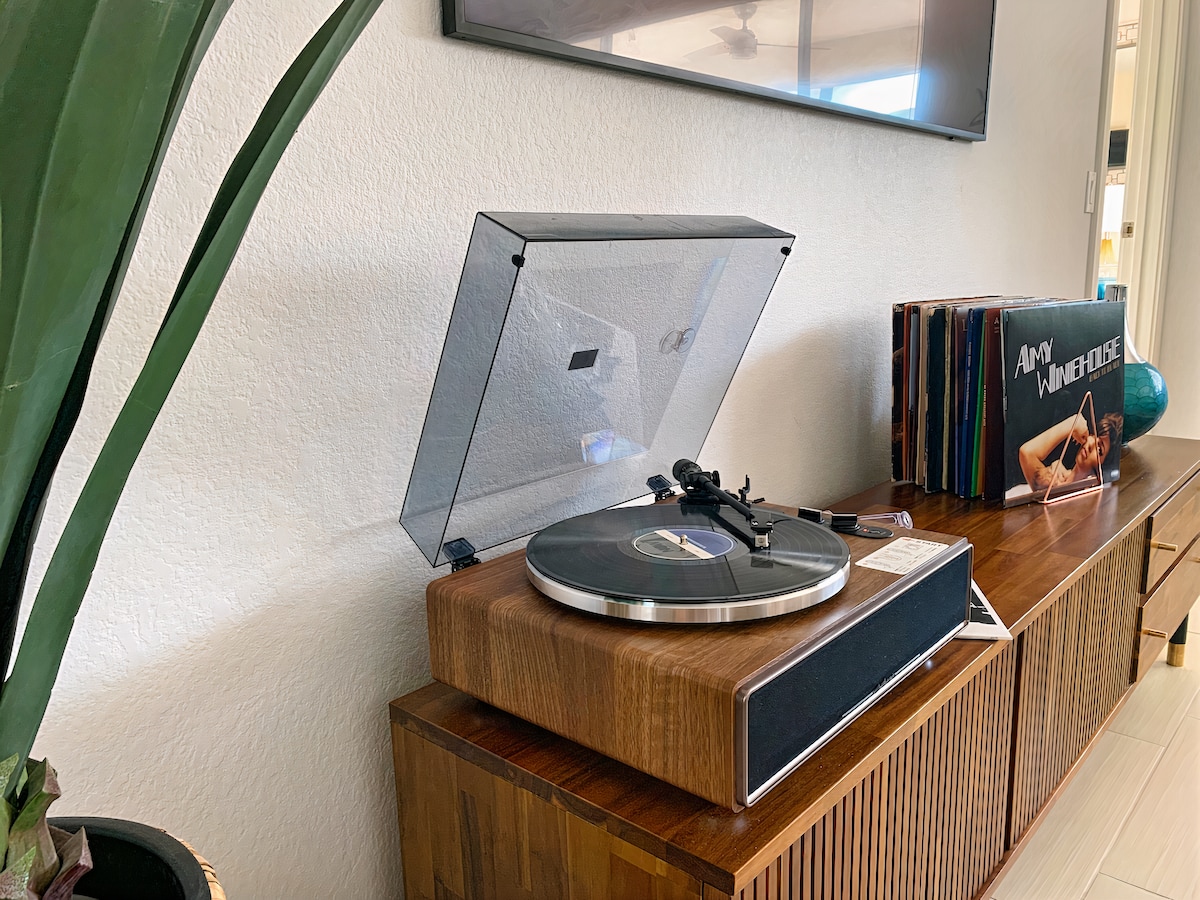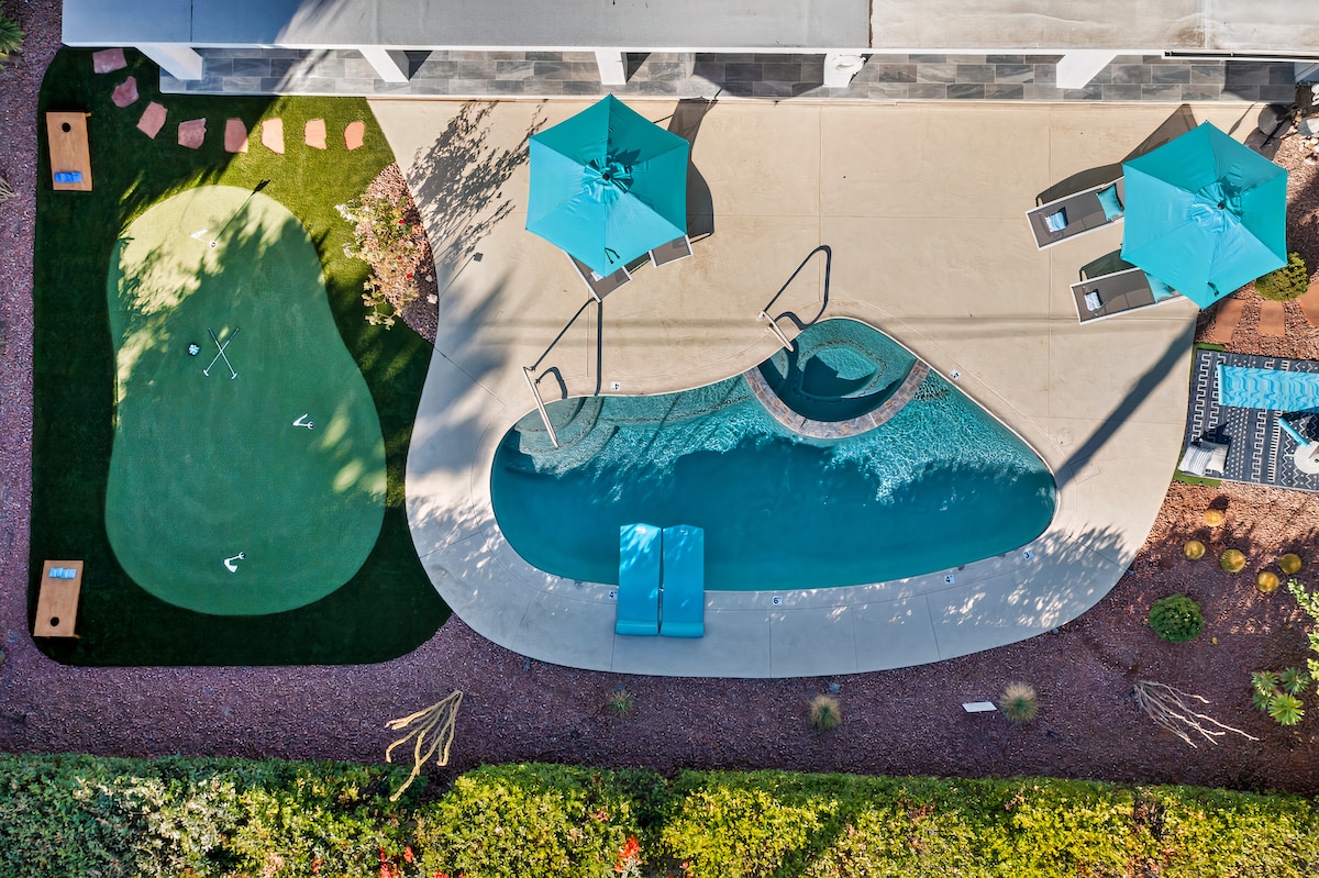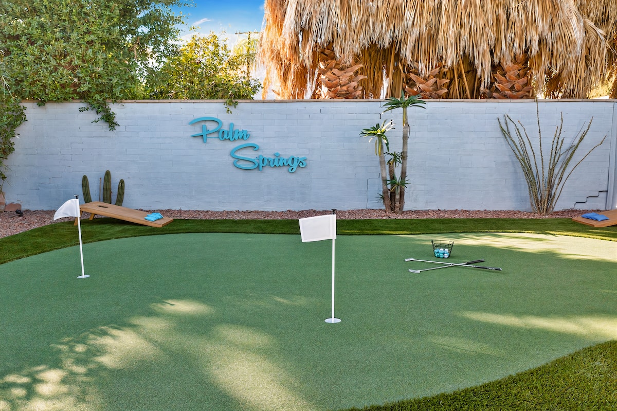 Palm SpringsCome feel the good vibes at the Blue Bungalow. Wake up with a coffee and a classic vinyl record. Take a short trip to downtown Palm Springs or just stay home and relax poolside at your private retreat. With the whole backyard to yourself, rejuvenate in the pool and spa, enjoy a good book on the hanging tipi bed, or work on your putting game on the custom green. Make your way to the private courtyard for a glass of wine...it's always happy hour here! Good memories await.